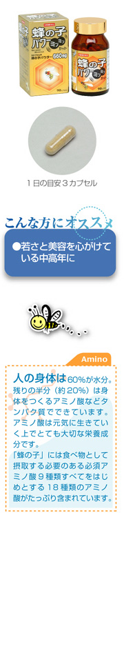 本品はこの生後21日前後の雄の蜂の子だけを使用したサプリメント。栄養分を損なうことなく新鮮な状態で冷凍乾燥し、粉末化してカプセルに詰めました。毎日の美容と健康にお役立てください。